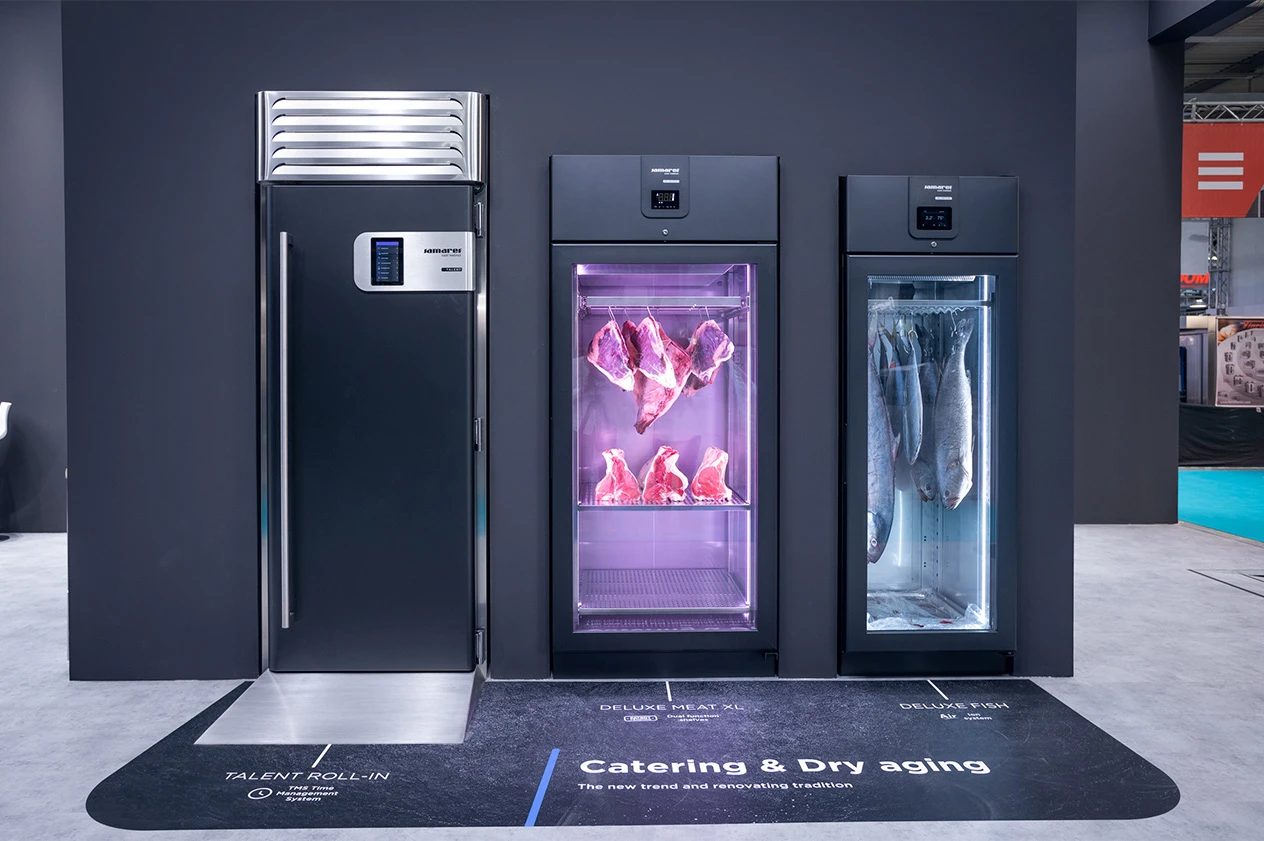 La gama Deluxe presentada en la versión XL con iluminación LED rosa, para la maduración de la carne, y la nueva versión Plus para la maduración del pescado captaron la atención de muchos profesionales. La nueva estantería con funcionalidad de gancho suscitó interés por su practicidad y los recetarios precargados en las máquinas, accesibles a través de las nuevas interfaces de pantalla táctil, demostraron que la facilidad de uso se une a la tecnología gracias también al nuevo sistema de depuración para garantizar productos de máxima calidad.