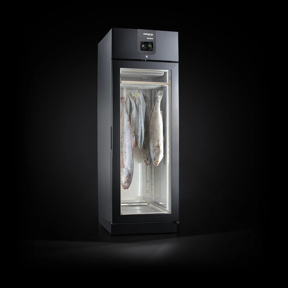 Durante i periodi di pesca l’armadio può essere dedicato alla frollatura del pesce mentre durante il blocco pesca può essere convertito nell’armadio per la frollatura della carne.