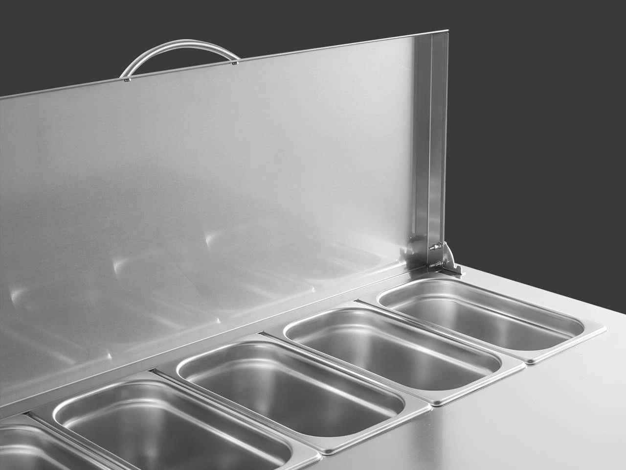 Крышка, легко поднимаемая и фиксируемая, гарантирует безопасность пищевых продуктов.